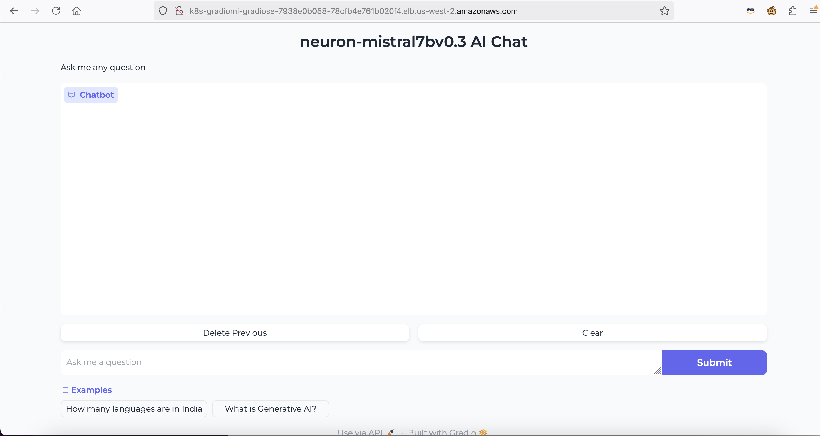 Now that our application is exposed to the outside world, let's access it by pasting the URL in your web browser. You will see the chat bot powered by the Mistral-7B-Instruct-v0.3 model and will be able to interact with it by asking questions.